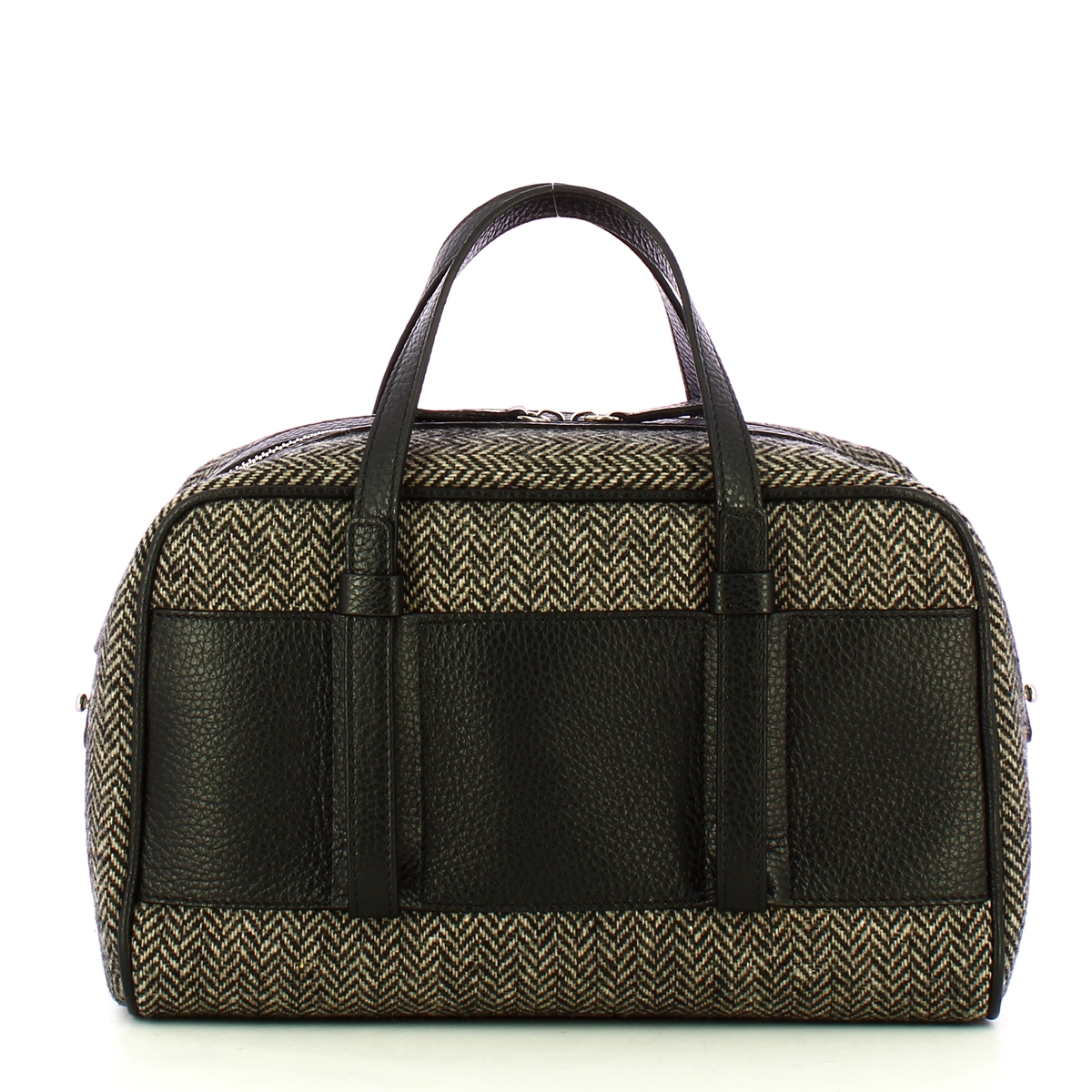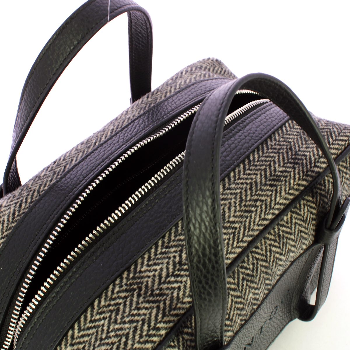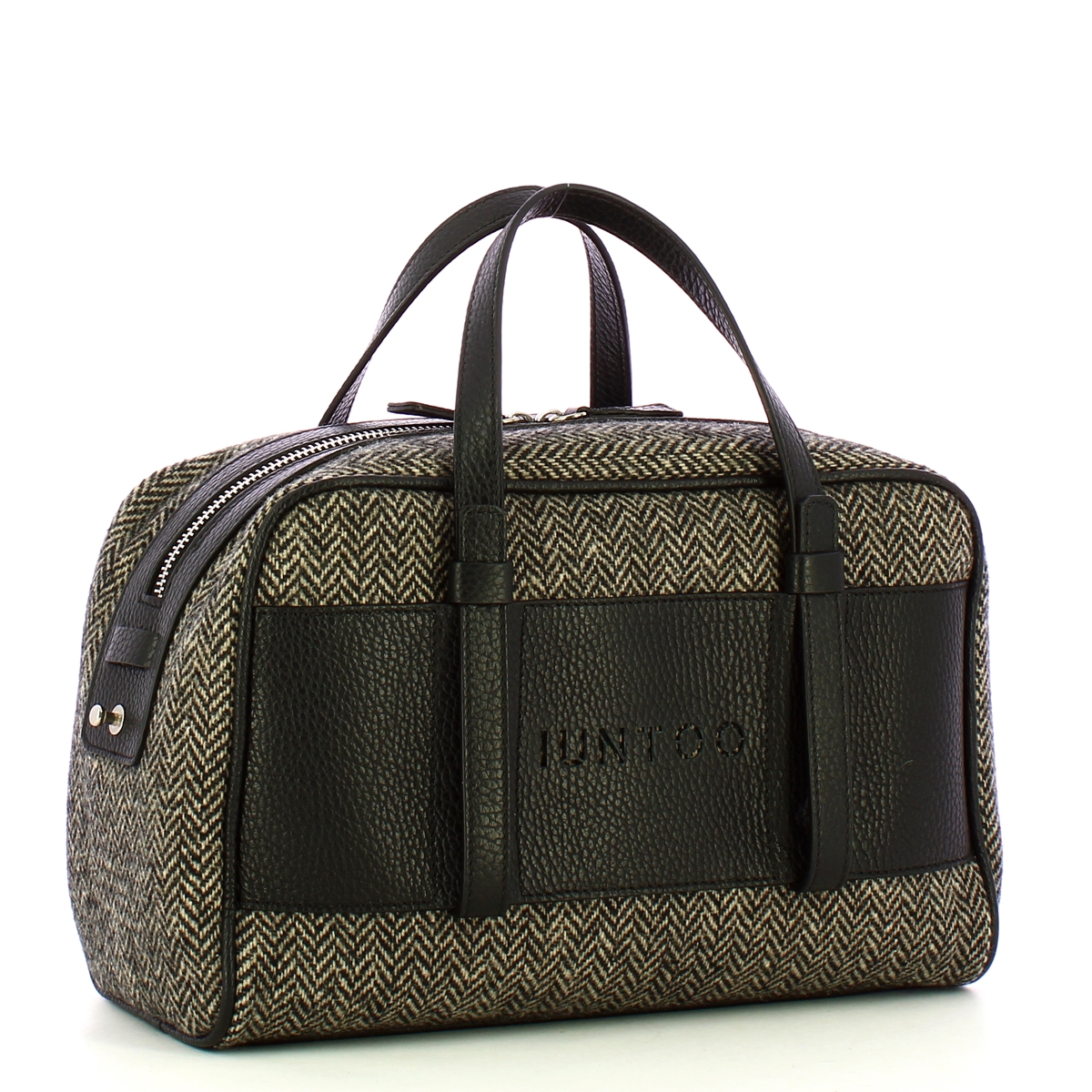 Bauletto Priora Piccolo Spigato Nero Iuntoo, accessorio organizzato ed elegante, realizzato in vera pelle e in tessuto con trama spigata. Doppio manico e tracolla in pelle regolabile rimovibile. Comparto chiuso con cerniera e doppia tiralampo, interno foderato completo di tasca.
