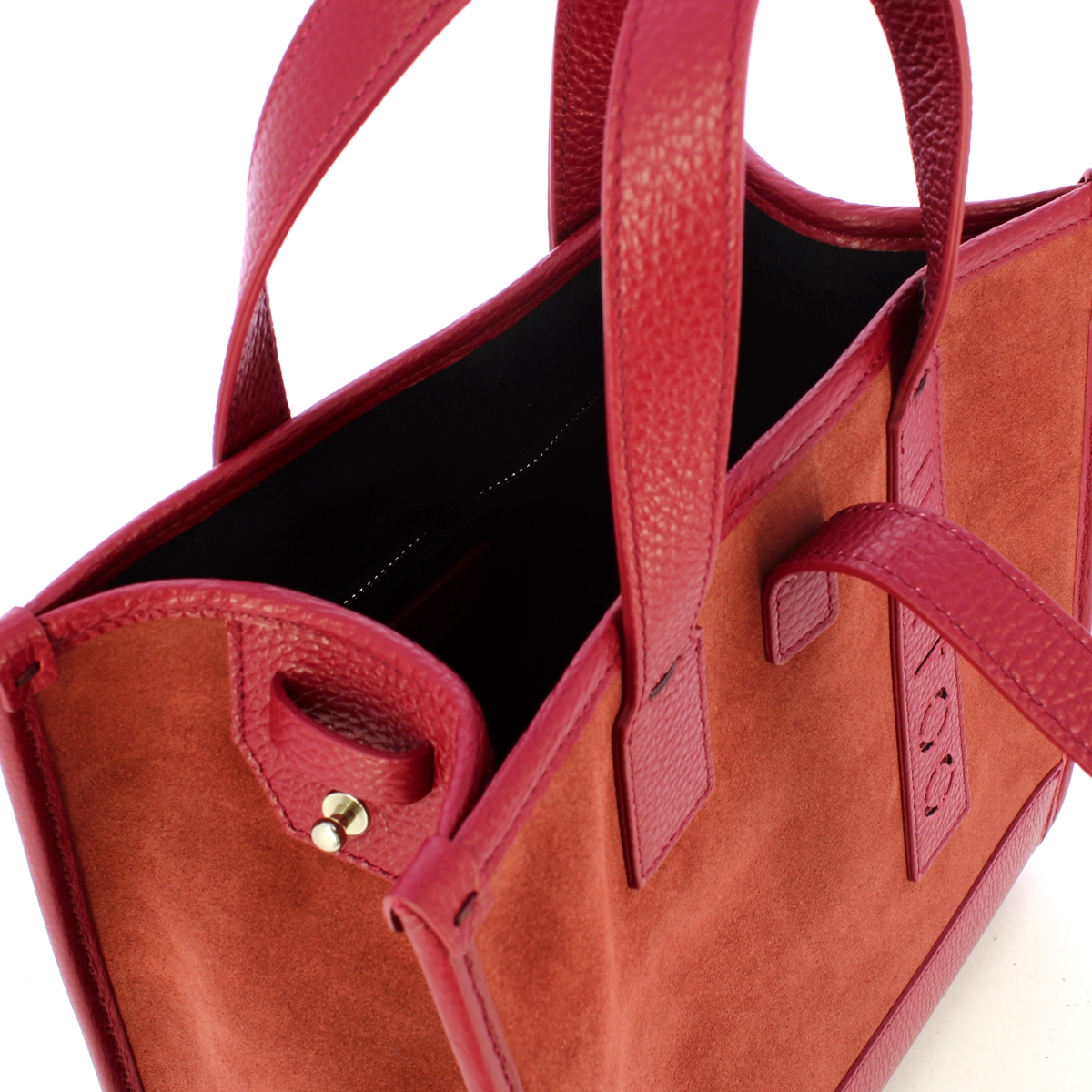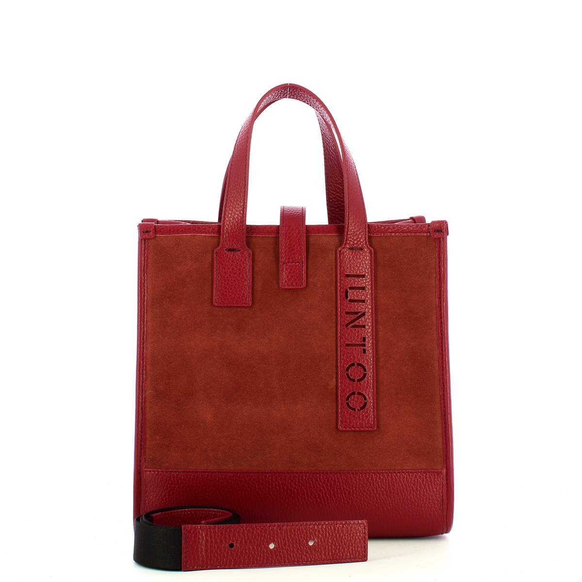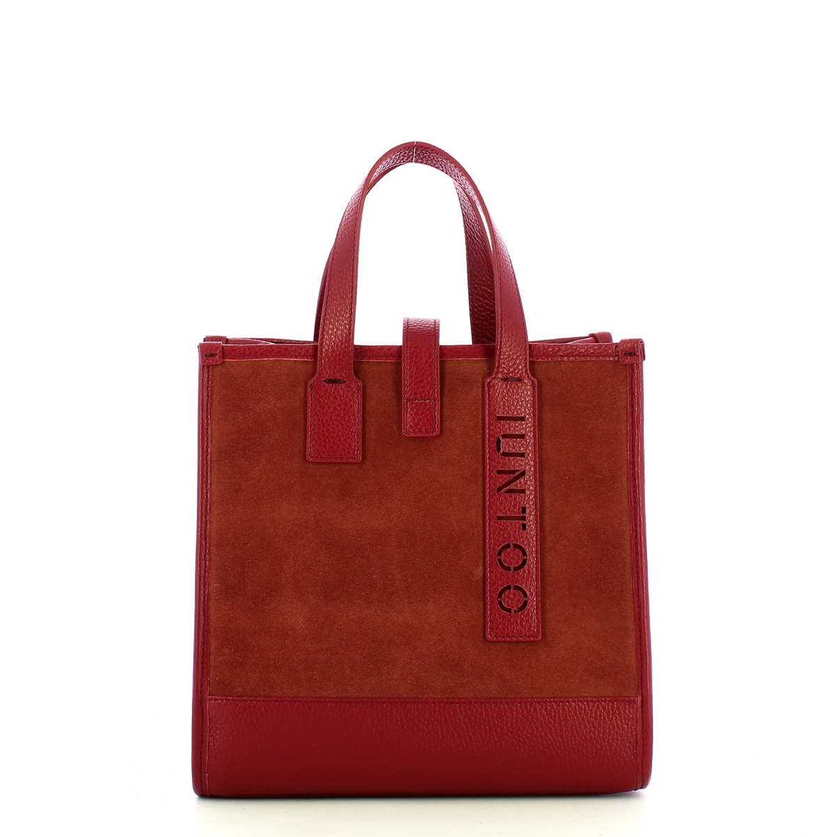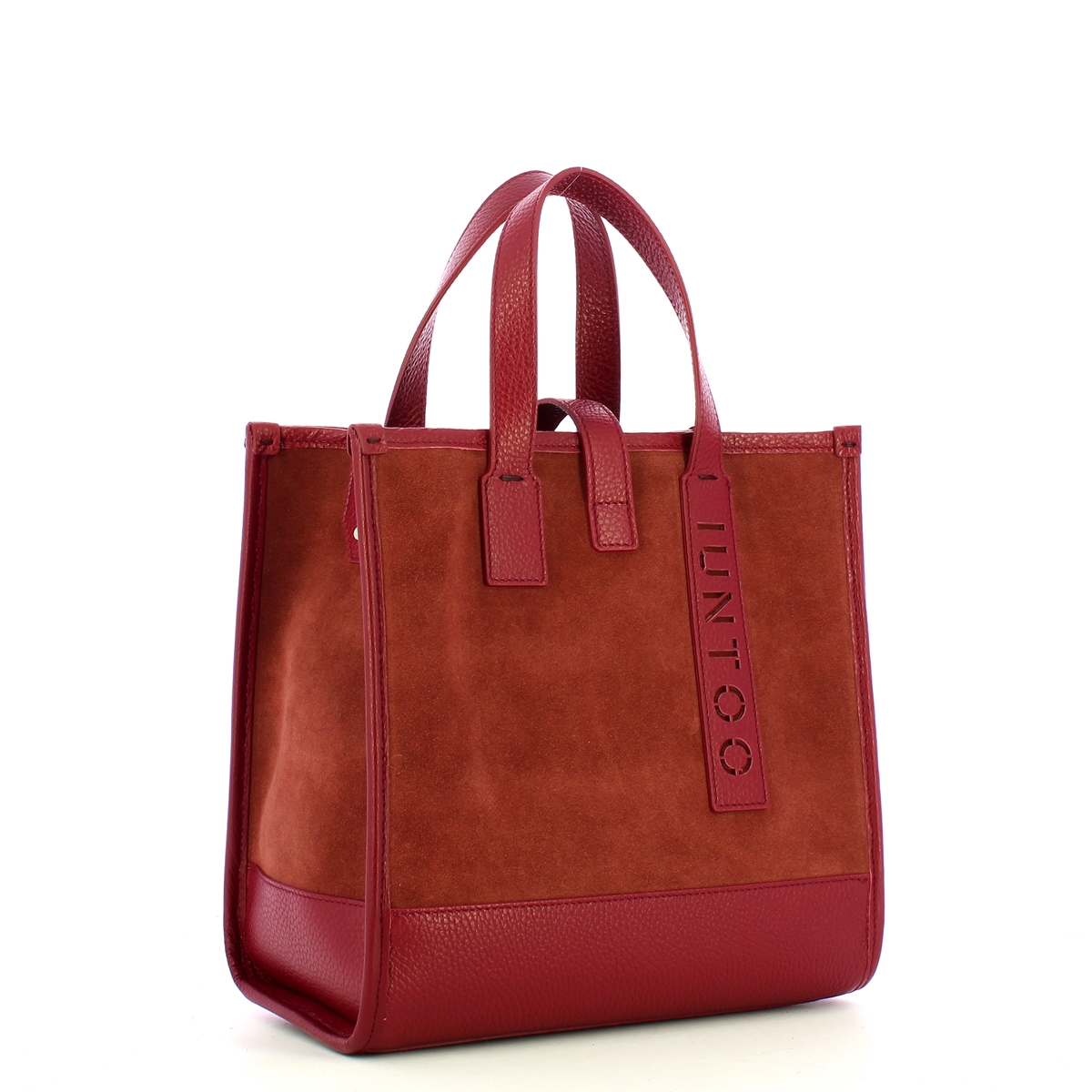 Borsa a mano Essenziale Piccola Bordeaux Scamosciato Iuntoo, elegante, compatta, ma spaziosa tote bag donna realizzata in vera pelle granata e scamosciata. Doppio manico e tracolla in tessuto regolabile e rimovibile. Chiusura con linguetta, interno foderato completo di tasca a parete zippata.