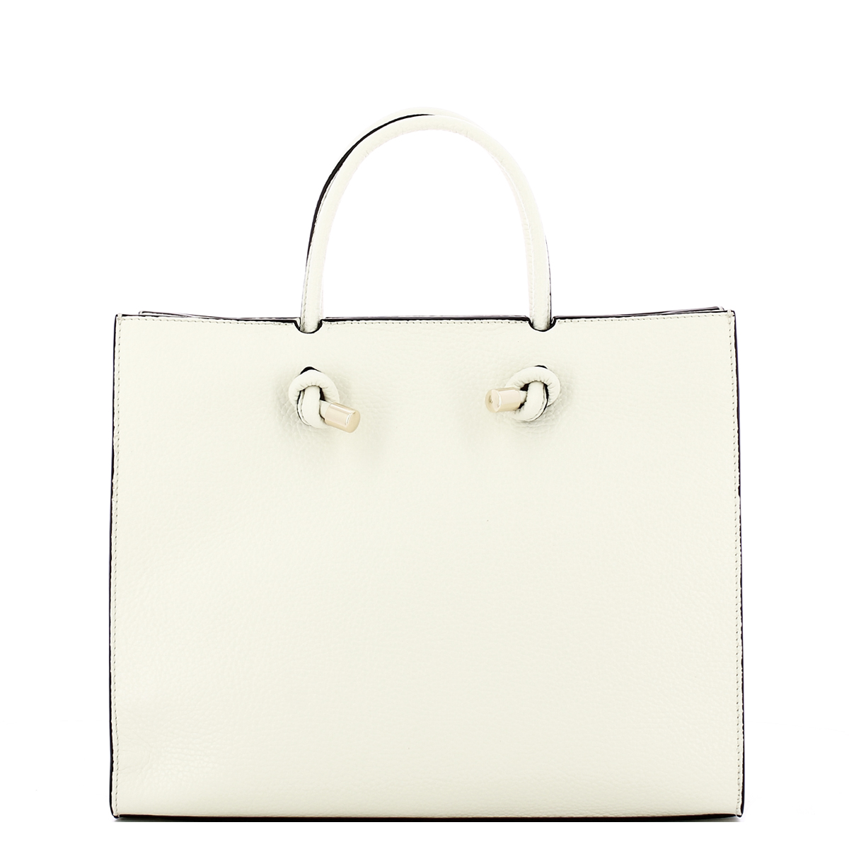Borsa a mano Grande Nodo Armonia Bianco Iuntoo, modello dalla linea classica, realizzato in sofisticata pelle martellata impreziosita dal logo lettering in metallo. Due comodi manici con terminali in metallo annodati, tracolla in pelle in dotazione regolabile e rimovibile. Comparto chiuso con cerniera e piedini sul fondo. Spazioso interno foderato completo di tasca a parete chiusa con zip.