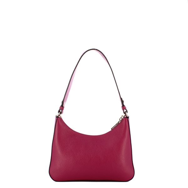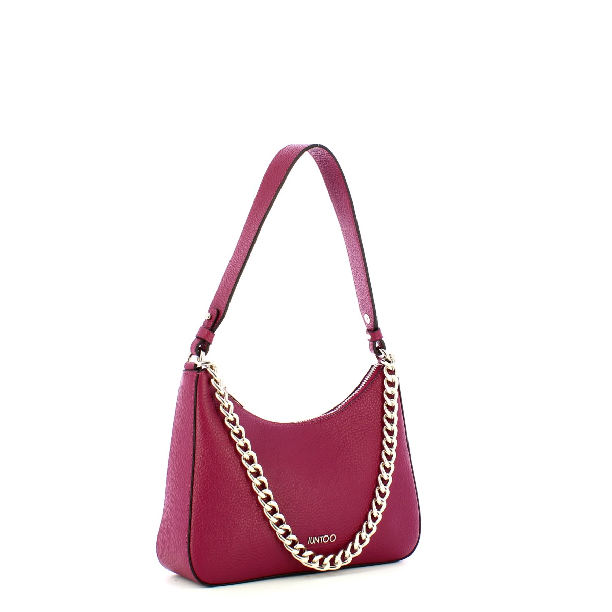 Borsa a spalla Media Eleganza Scarlatto Iuntoo, versatile ed elegante sottospalla realizzato in pelle martellata, con logo lettering frontale. Dotata di manico singolo in pelle e manichetto in catena argentata. Funzionale tracollina regolabile e removibile. Comparto con chiusura con cerniera e interno foderato, completo di tasche.