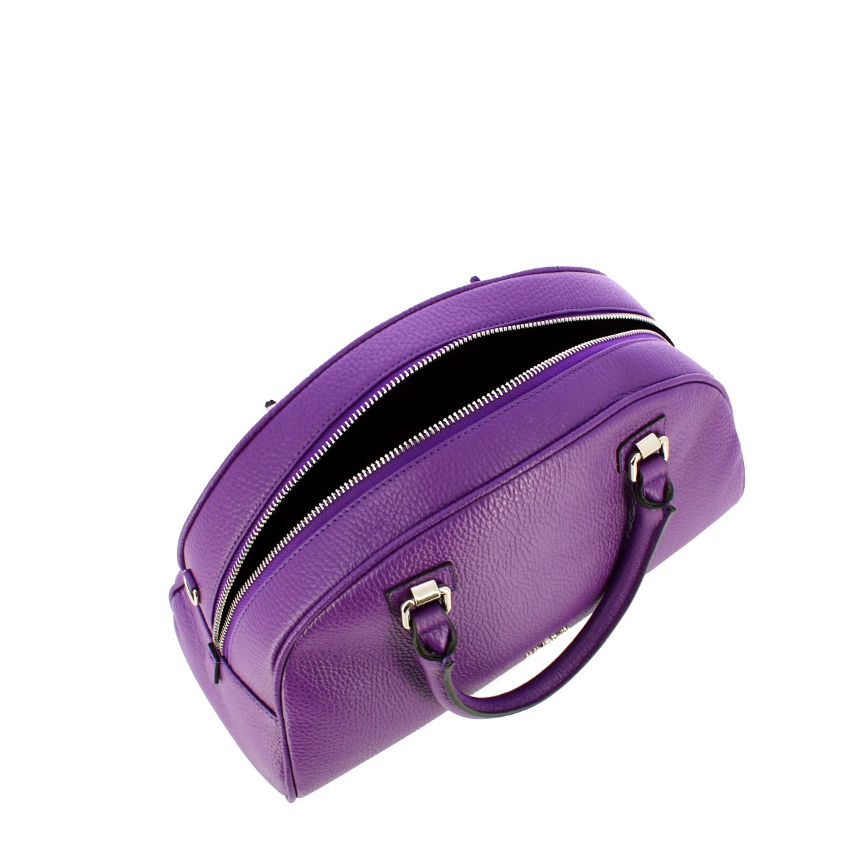 Bowling Bag Grande Accattivante Viola Iuntoo, borsa a mano in pelle dal design caratteristico, che ricorda le iconiche borse da bowling. Dotata di doppi manici e tracollina regolabile e removibile, logo lettering frontale in metallo argentato e comparto con chiusura con cerniera e interno foderato, completo di tasche.