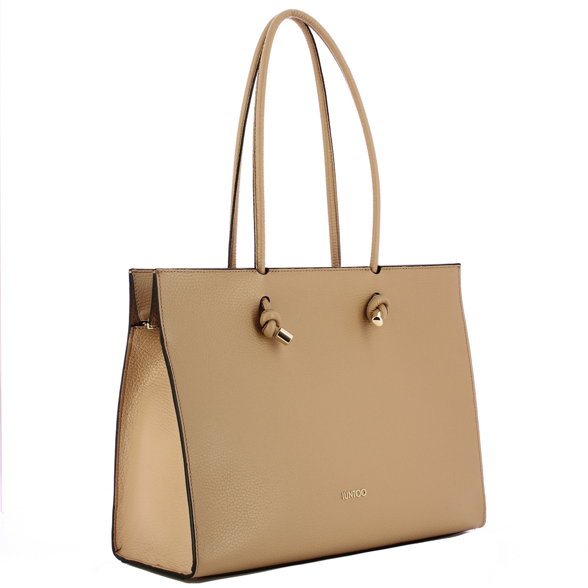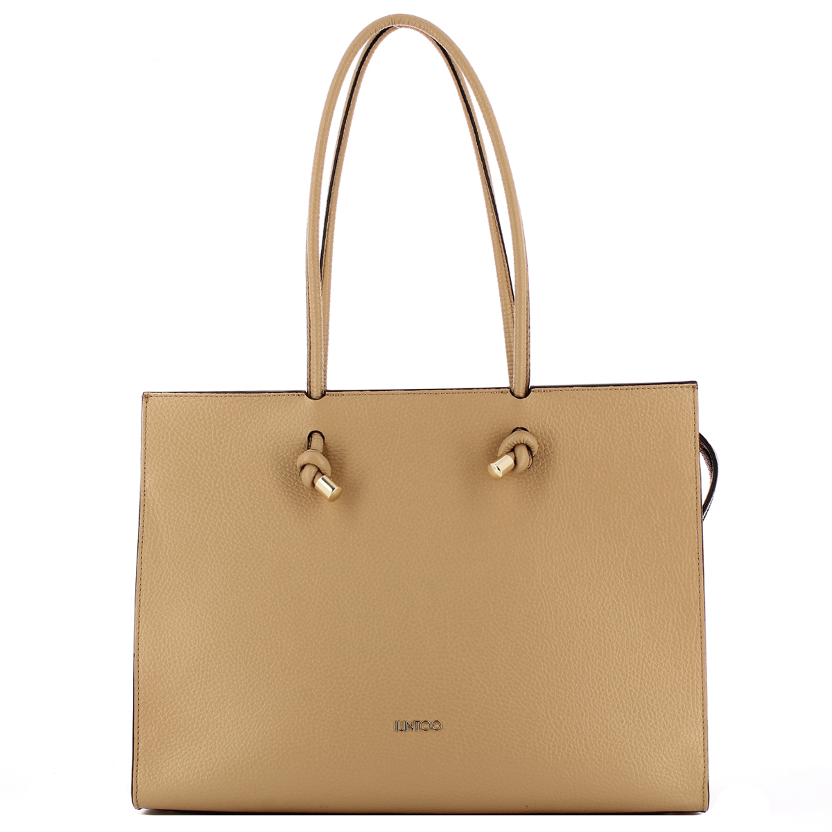 Horizontal Shopper Armonia Cammello Iuntoo, modello a spalla dalla linea classica, realizzato in pelle martellata impreziosita dal logo lettering in metallo. Due ampi manici con terminali in metallo annodati, comparto chiuso con cerniera e piedini sul fondo. Spazioso interno foderato completo di tasca a parete chiusa con zip.
