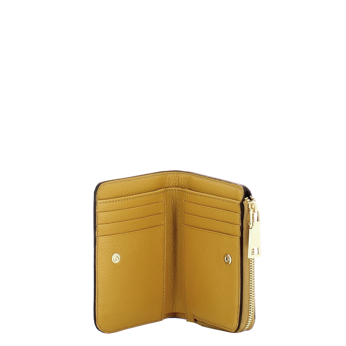 Portafoglio medio Armonia Curcuma Iuntoo, modello compatto in pelle granata. Spaziosa tasca esterna con cerniera per le monete. Chiusura principale con bottone a pressione che racchiuse vani porta tessere e uno scomparto per le banconote.