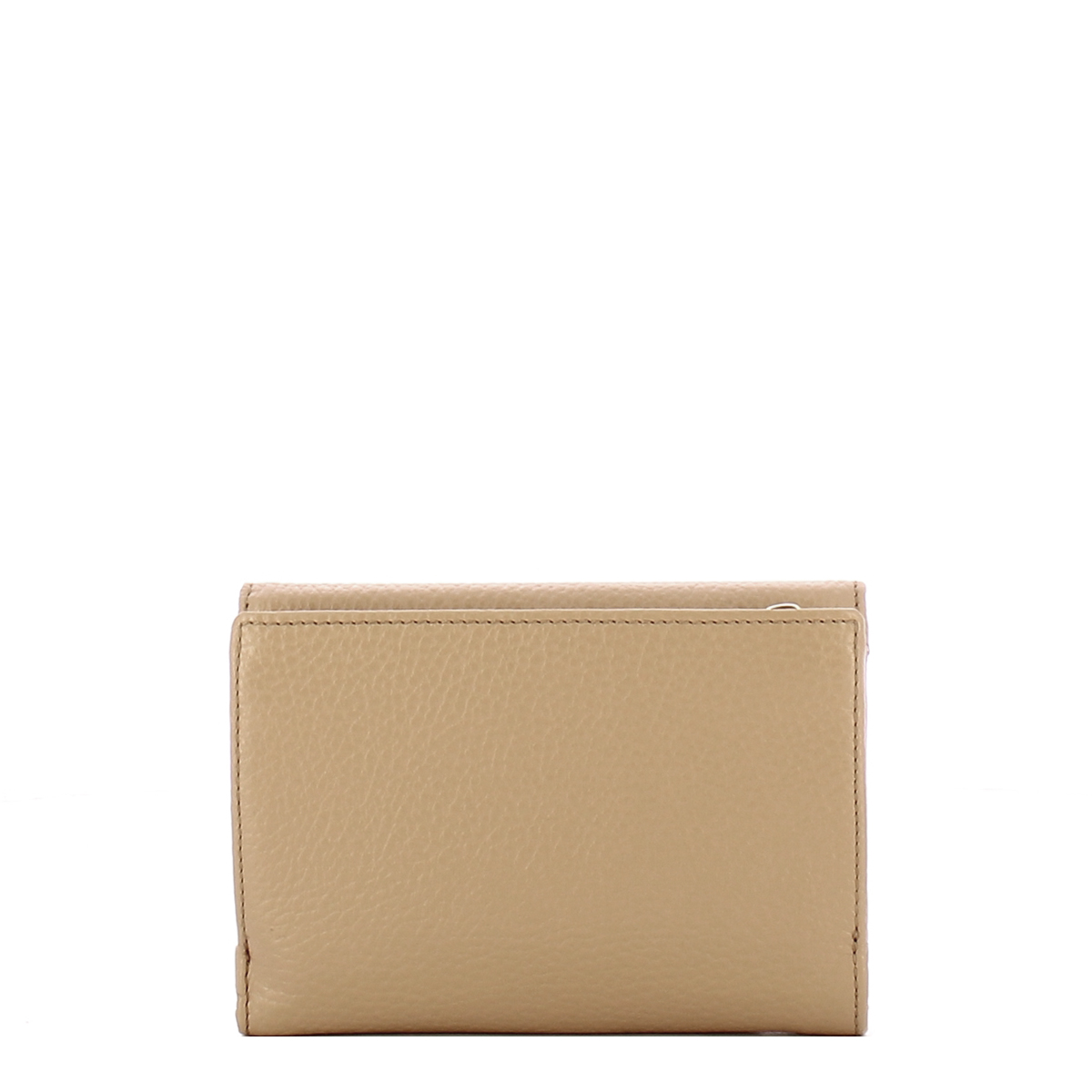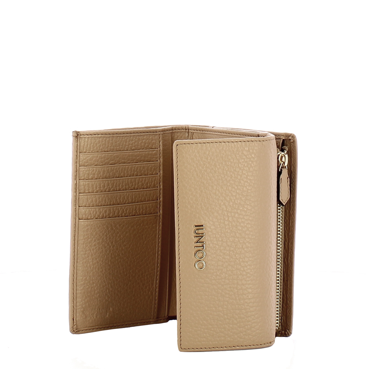 Portafoglio Medio con Patta Armonia Cammello Iuntoo, modello classico e funzionale, in raffinata pelle. Tasca esterna con zip porta monete e chiusura principale con patta logata e bottoncino a pressione. Interno organizzato in numerose fessure per tessere e documenti, e due vani per le banconote.