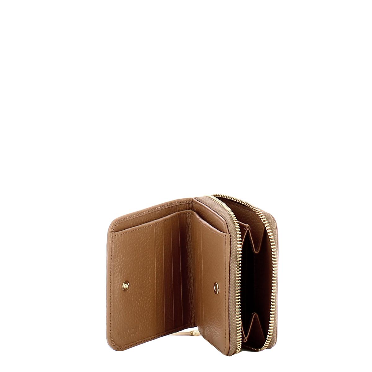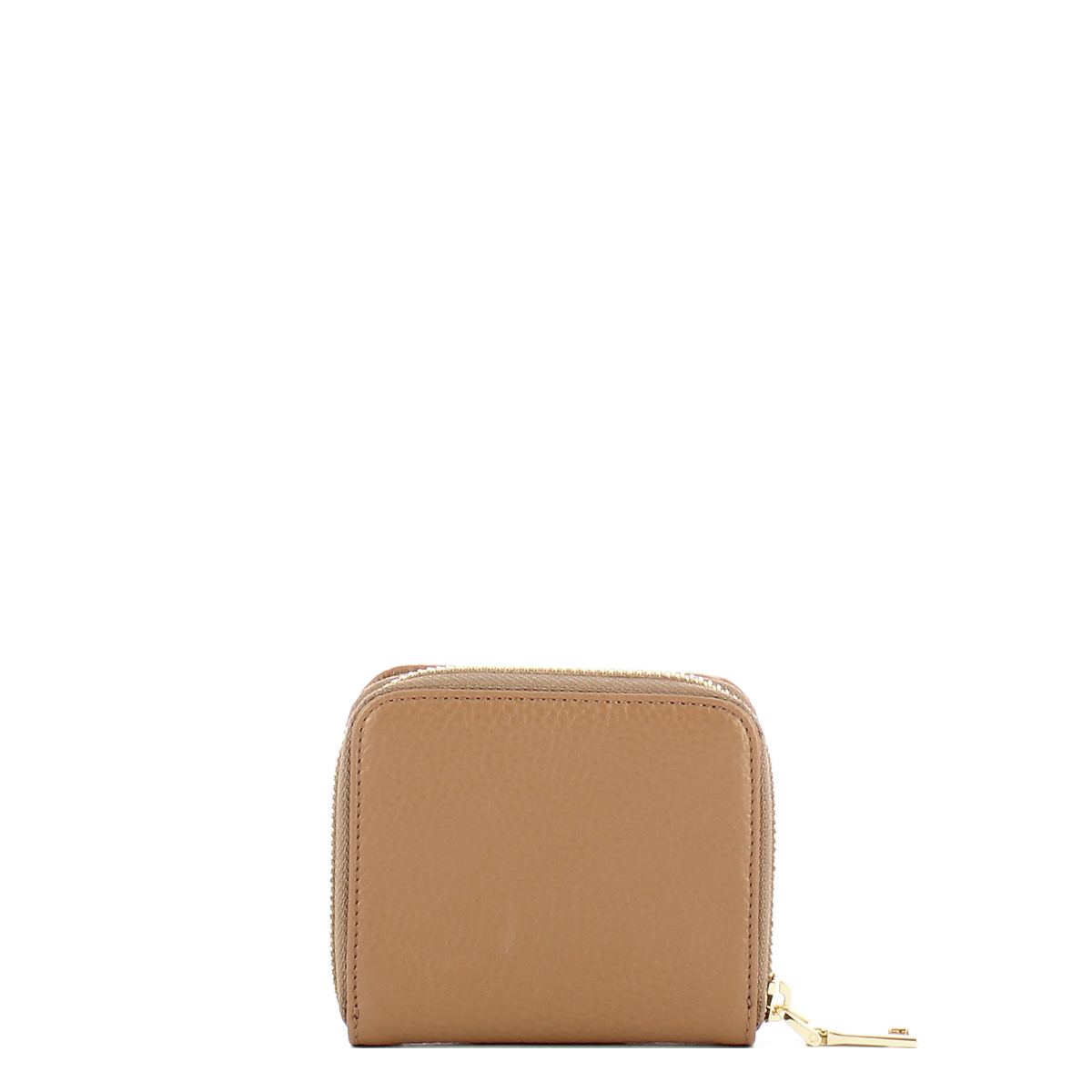 Portafoglio piccolo Armonia Caramello Iuntoo, modello compatto in pelle granata. Spaziosa tasca esterna con cerniera per le monete. Chiusura principale con bottone a pressione che racchiuse vani porta tessere e due scomparti per le banconote.