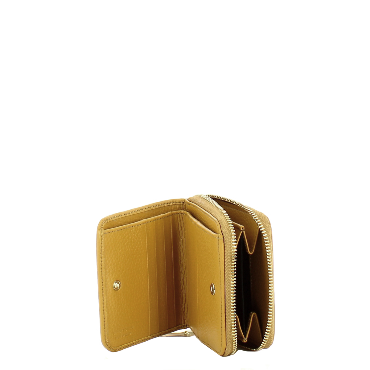 Portafoglio piccolo Armonia Curcuma Iuntoo, modello compatto in pelle granata. Spaziosa tasca esterna con cerniera per le monete. Chiusura principale con bottone a pressione che racchiuse vani porta tessere e due scomparti per le banconote.