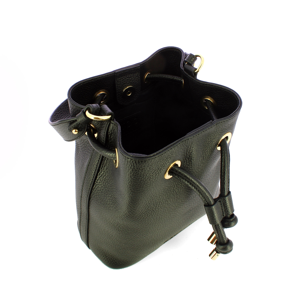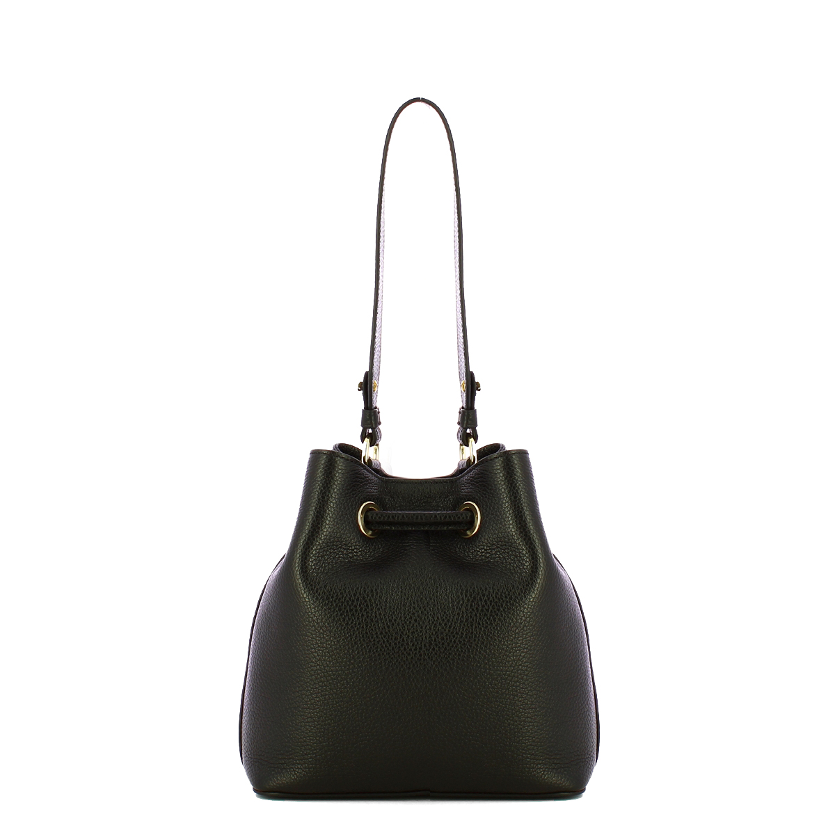 Secchiello Nodo Armonia Nero Iuntoo, borsa a mano senza tempo. Realizzata in pelle martellata, dalle linee pulite e semplici, decorato con logo frontale inciso. Comodo manico singolo, chiusura con coulisse e magnete. Interno foderato e provvisto di taschino.