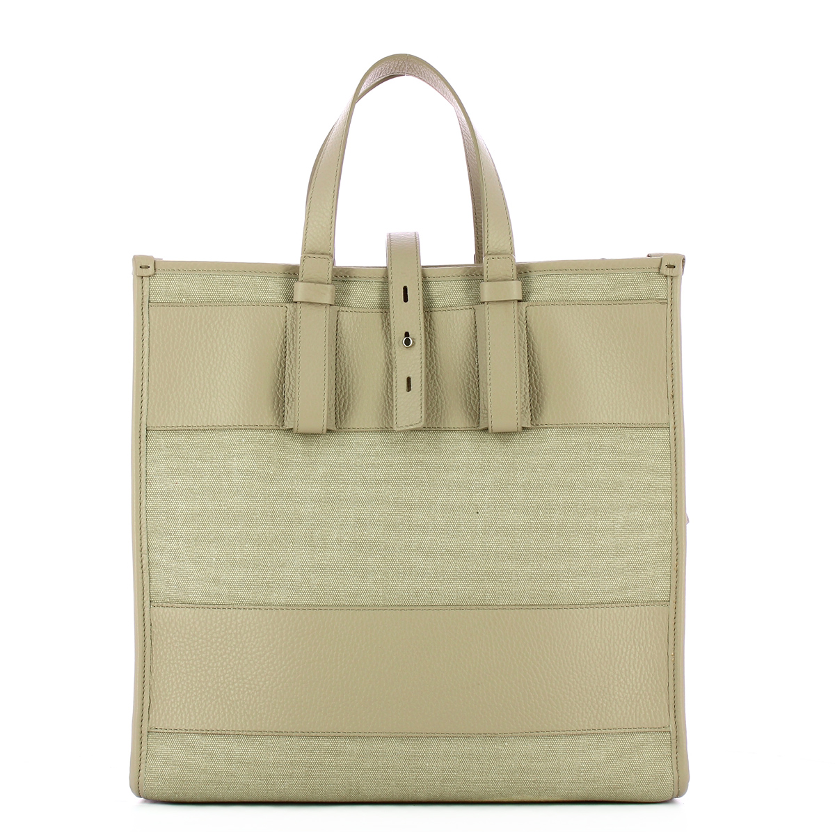 Shopper Grande Essenziale Beige Beige Iuntoo, spaziosa e squadrata shopper realizzata in tessuto, cn dettagli e bordi in vera pelle martellata. Fascia frontale in pelle con logo inciso, doppi manici e tracolla regolabile e removibile in nastro. Comoda chiusura con fascetta con bottocino ad incastro, interno foderato e taschino con zip.
