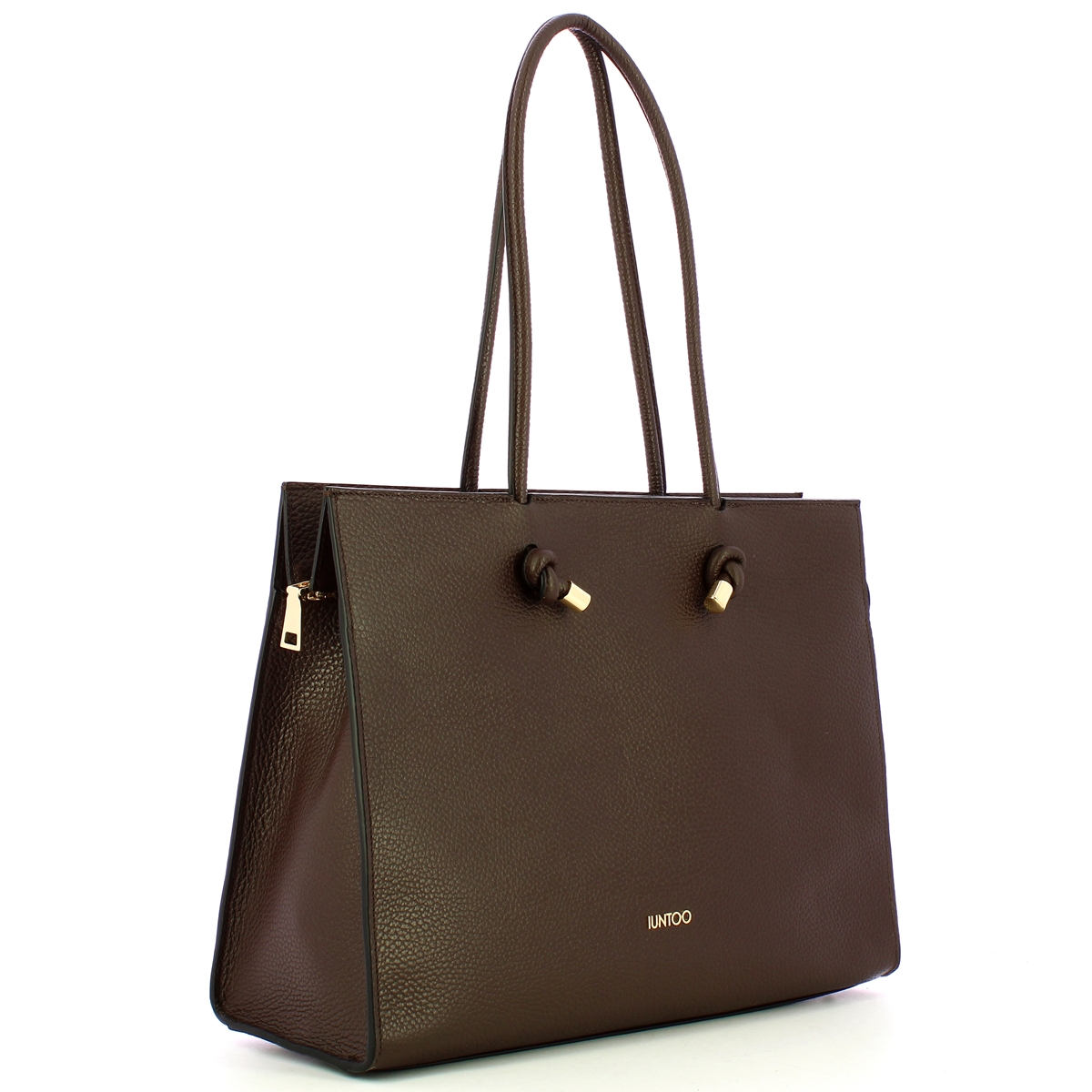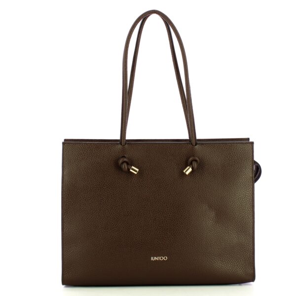 Shopper Orizzontale Nodo Armonia Nodo Iuntoo, spaziosa ed elegante borsa a spalla con logo lettering e piedini in metallo. Doppio manico con terminali annodati, comparto chiuso con cerniera e interno foderato completo di tasca.