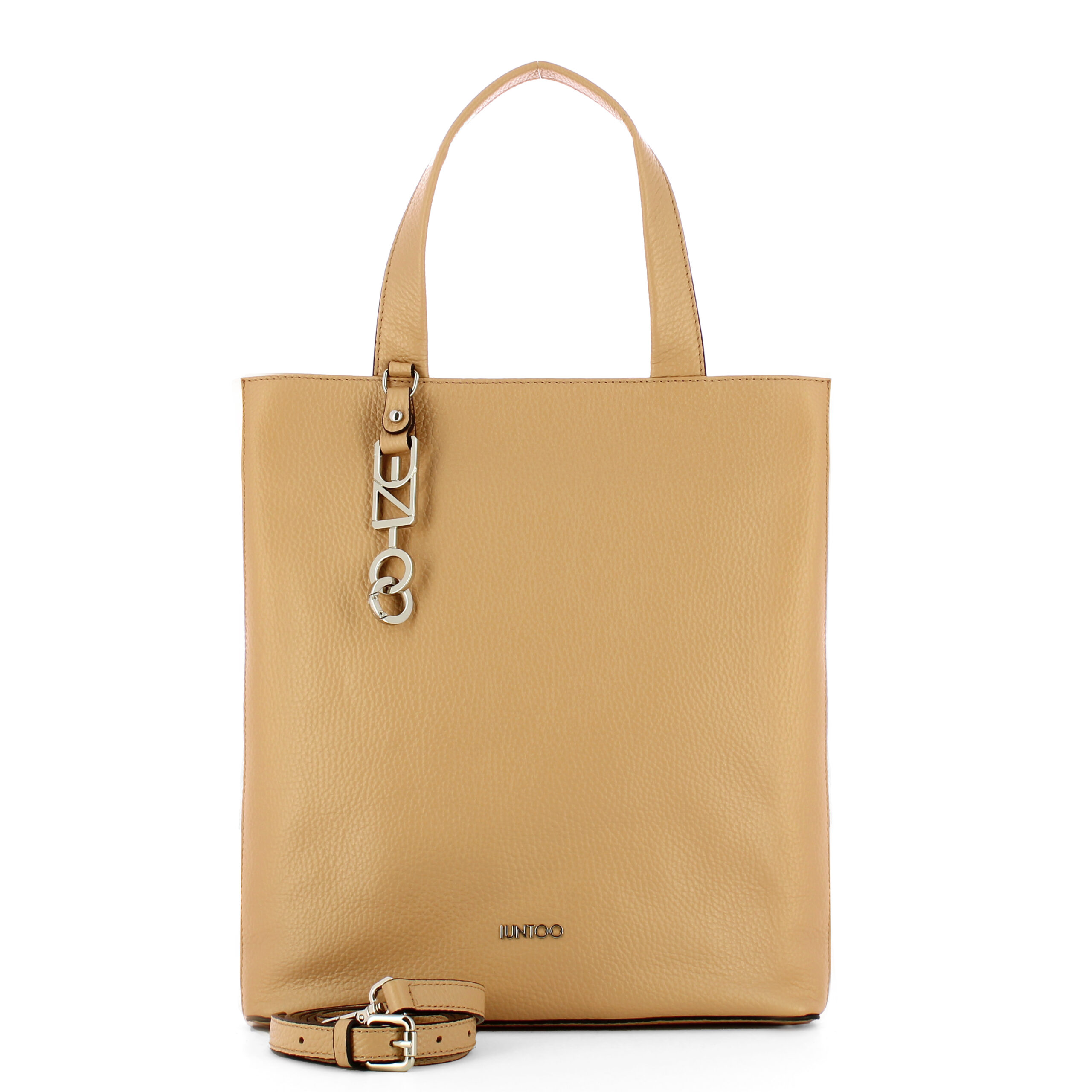 Shopper Verticale Grande Armonia Biscotto Iuntoo, moderna e spaziosa borsa a mano realizzata in pelle martellata, con ciondolo in metallo logato e doppi manici. Comoda tracollina regolabile e removibile. Comparto con chiusura con pattina interna e magnete, fodera e tasche.