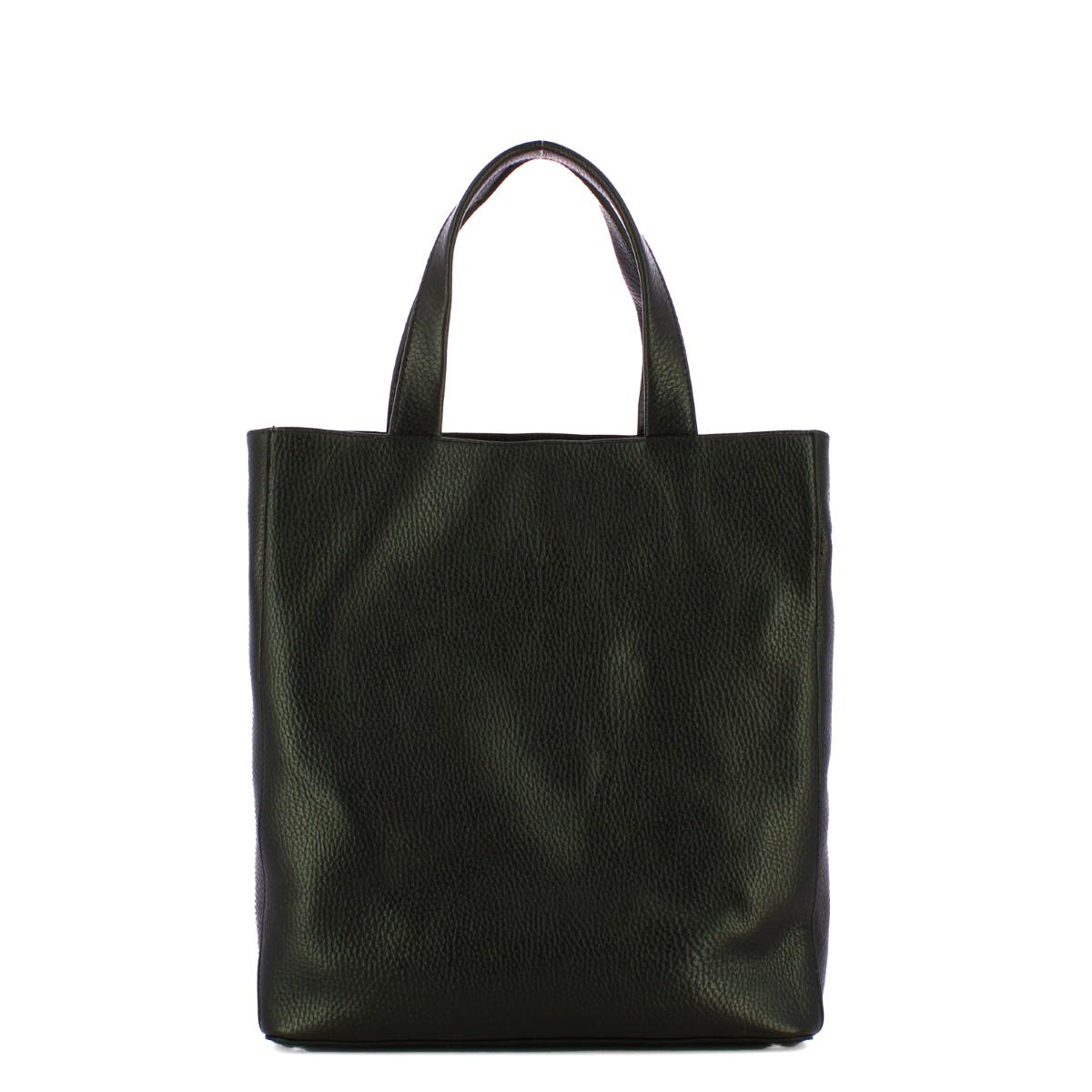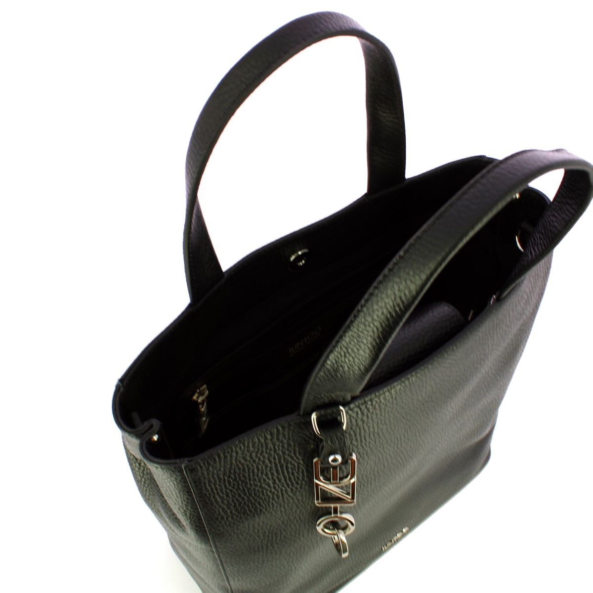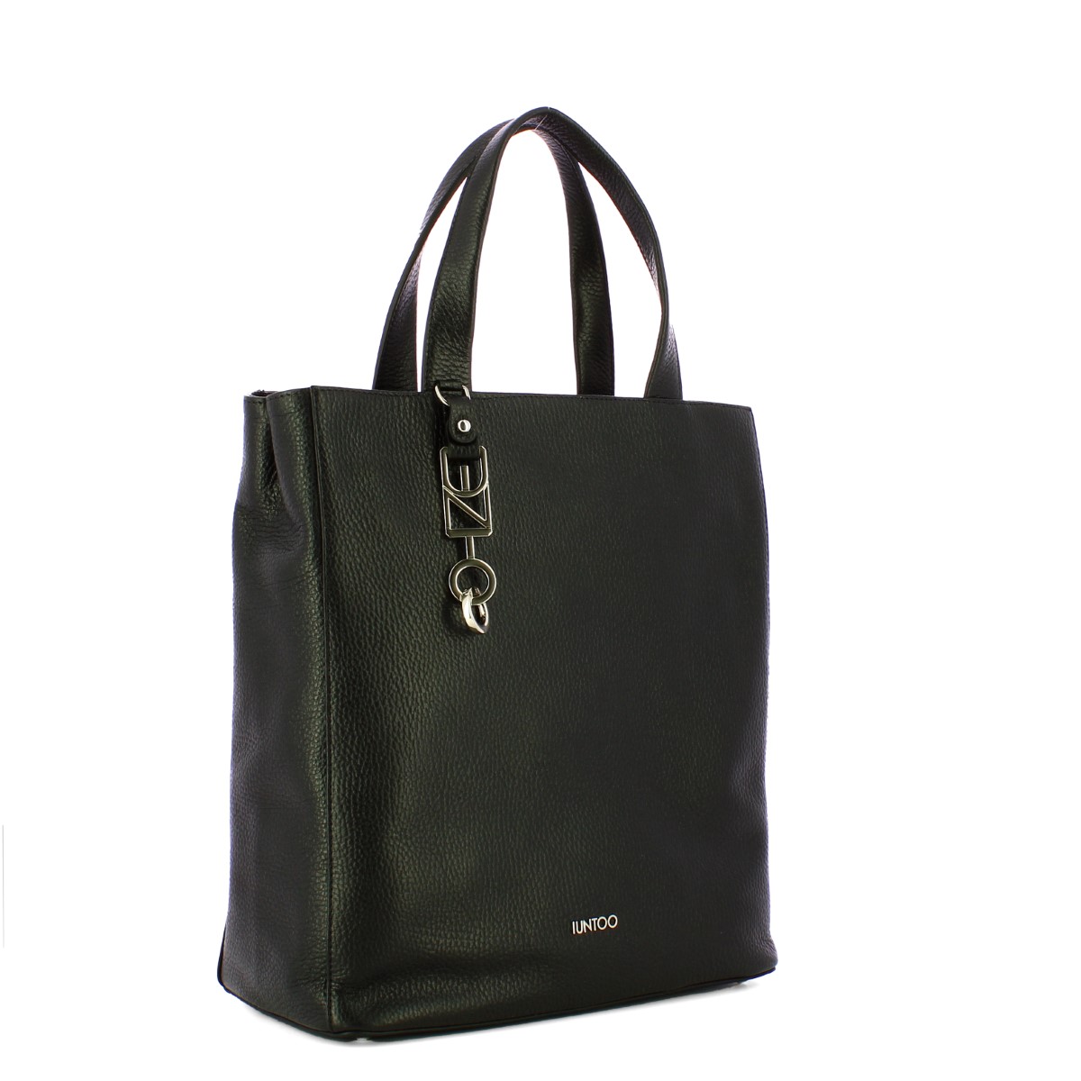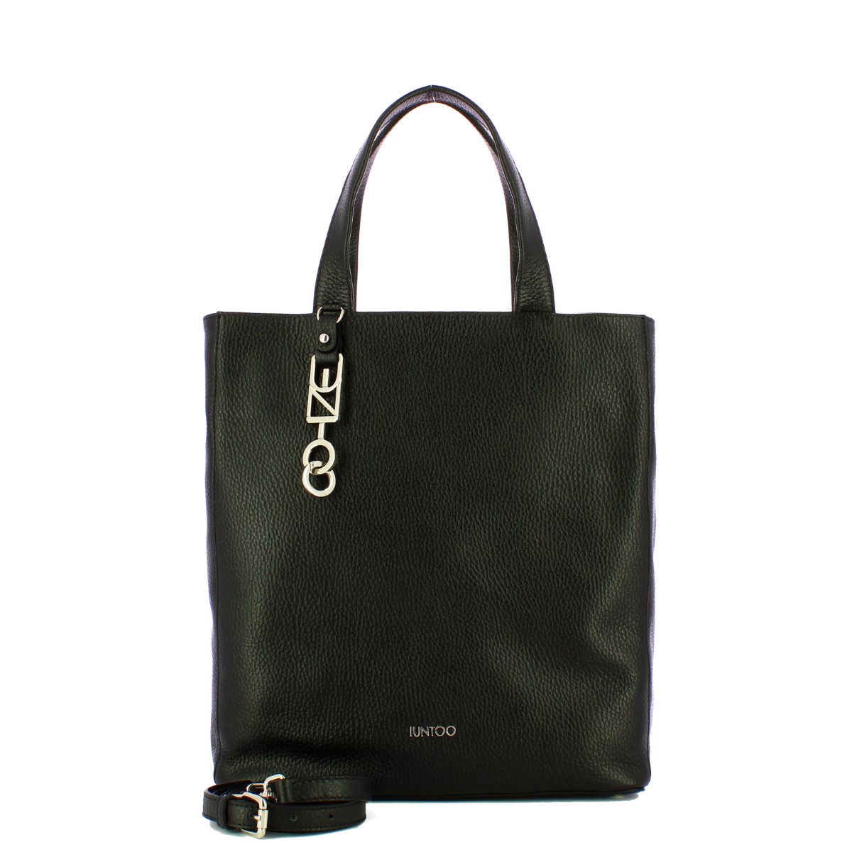Shopper Verticale Grande Armonia Nero Iuntoo, funzionale e spaziosa borsa a mano realizzata in pelle martellata e decorata con un ciondolo in metallo a forma di logo. Comodi doppi manici e tracollina regolabile e removibile. Comparto con chiusura con patta interna e magnete. Interno foderato e completo di tasche.