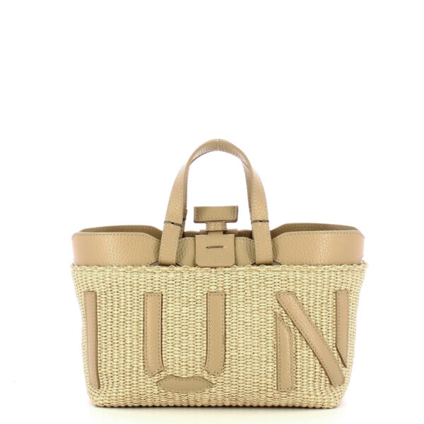 Shopping Sibilla Mini Logo Raffia Naturale+Cammello Iuntoo, modello compatto dal design ricercato, realizzato in raffia intrecciata e pelle, com maxi logo. Doppio manico e tracolla abbinata regolabile rimovibile. Spazioso comparto chiuso con gancio e foderato, provvisto di tasca con cerniera.