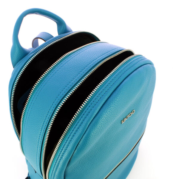 Zaino in pelle Armonia Mediterraneo Iuntoo, spazioso e sportivo accessorio donna a spalla, realizzato in pelle martellata. Versatile e funzionale, dotato di taschino frontale con cerniera, manichetto superiore e spallacci regolabili. Doppie tasche principali con cerniera e interno foderato, completo di tasche. Decorata con ciondolo logato in matello argentato.