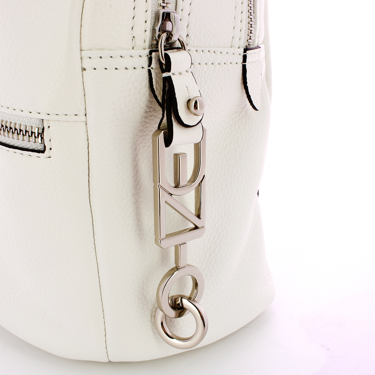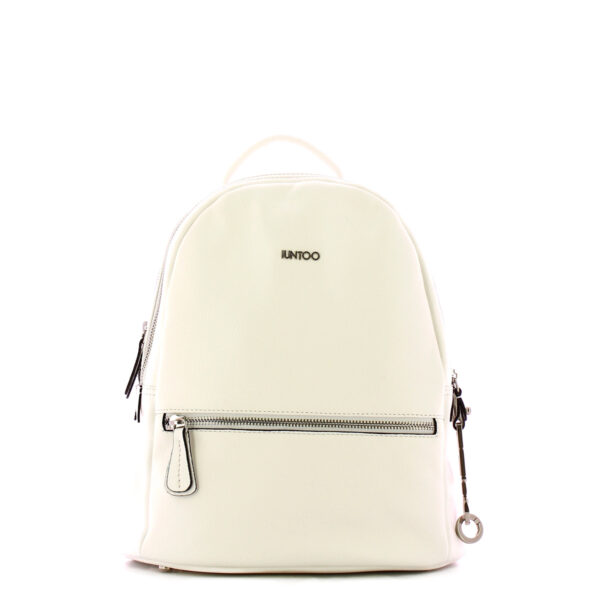 Zaino in pelle Armonia White Iuntoo, spazioso e sportivo accessorio donna a spalla, realizzato in pelle martellata. Versatile e funzionale, dotato di taschino frontale con cerniera, manichetto superiore e spallacci regolabili. Doppie tasche principali con cerniera e interno foderato, completo di tasche. Decorata con ciondolo logato in matello argentato.